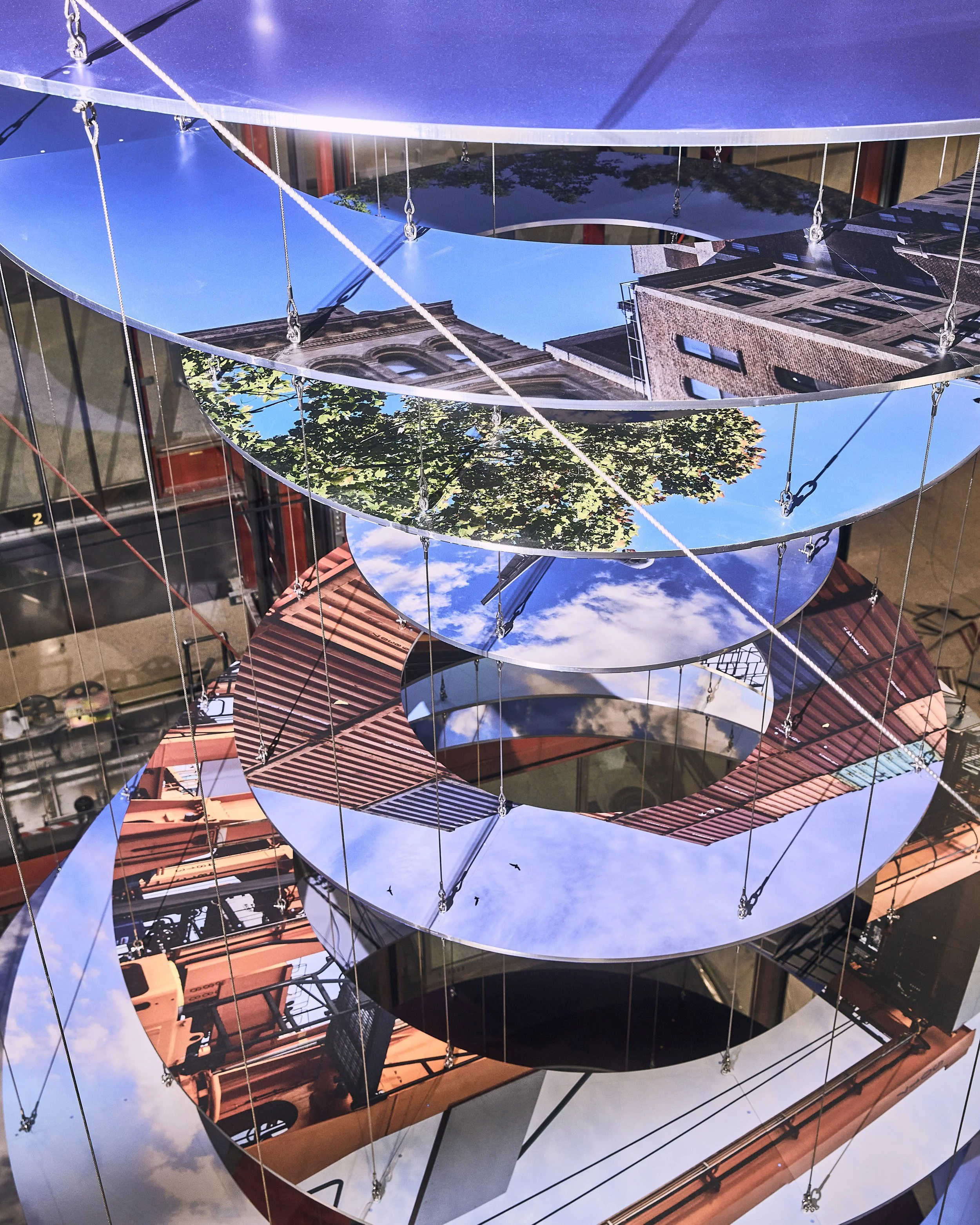 To create Approach, I embarked on an extensive photographic survey of Newark and the surrounding region. The resulting photos of land and sky are fragmented, then suspended in two helix-like structures: one that depicts daytime and the other night. Each photographic ring is double-sided, and presents two distinct views: when looking up, a bird’s eye view; and when looking down from above, a skyward view. Both sculptures can be viewed from all three terminal levels. A mirrored disc near the ceiling reflects and inverts the images of the sky and the terminal architecture and activity.